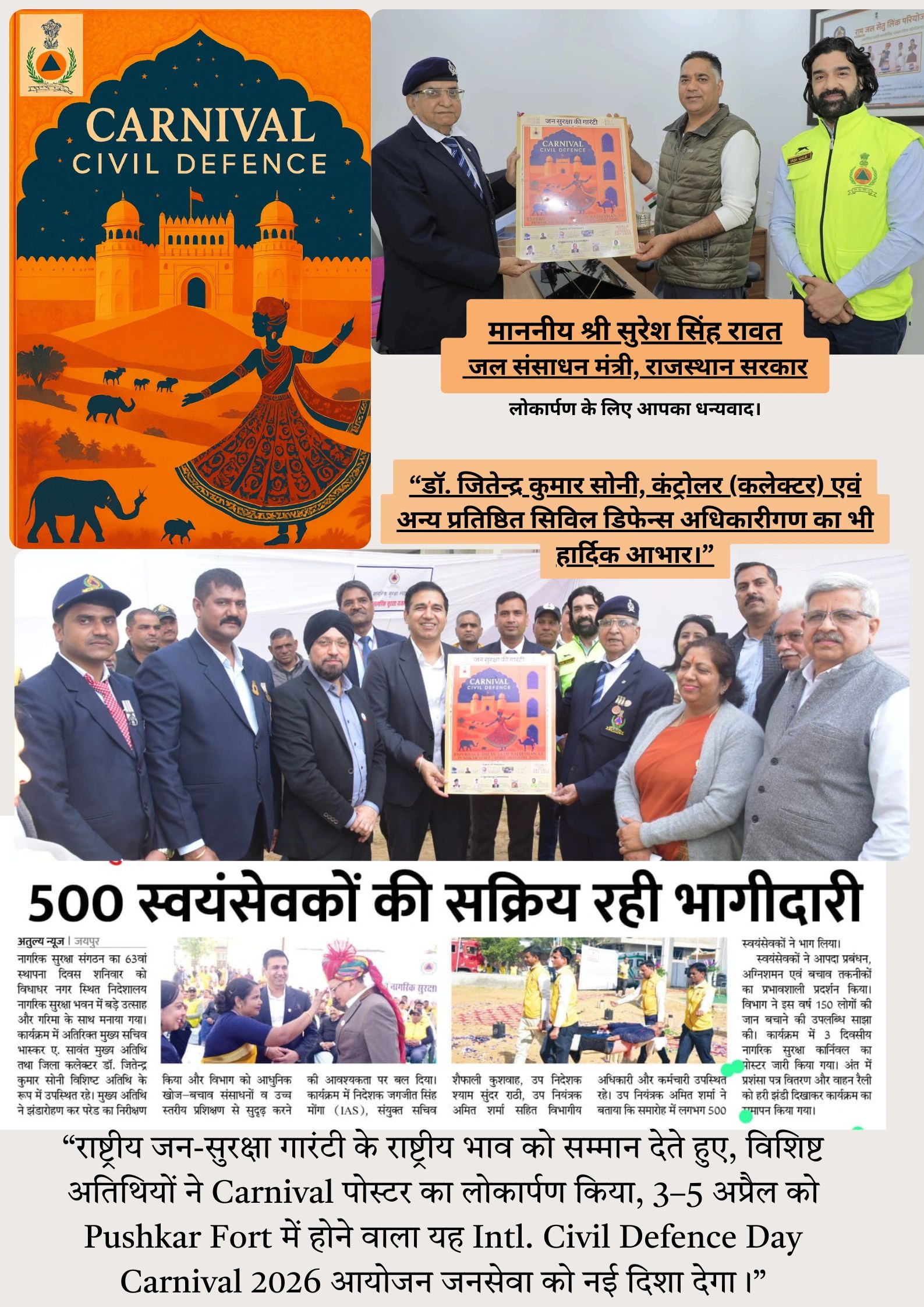 नागरिक सुरक्षा की वार्डन सर्विसेज, जो पूर्णतया निःशुल्क और समर्पित भावना से कार्य करती है, के चीफ वार्डन, डिप्टी चीफ वार्डन तथा अन्य स्वयंसेवकों ने एक आयोजन समिति का गठन किया है। इसी क्रम में, "जन सुरक्षा की गारंटी" की थीम के साथ इंटरनेशनल सिविल डिफेंस डे को चिह्नित करते हुए, सिविल डिफेंस कार्निवल एट पुष्कर का आयोजन किया जा रहा है।